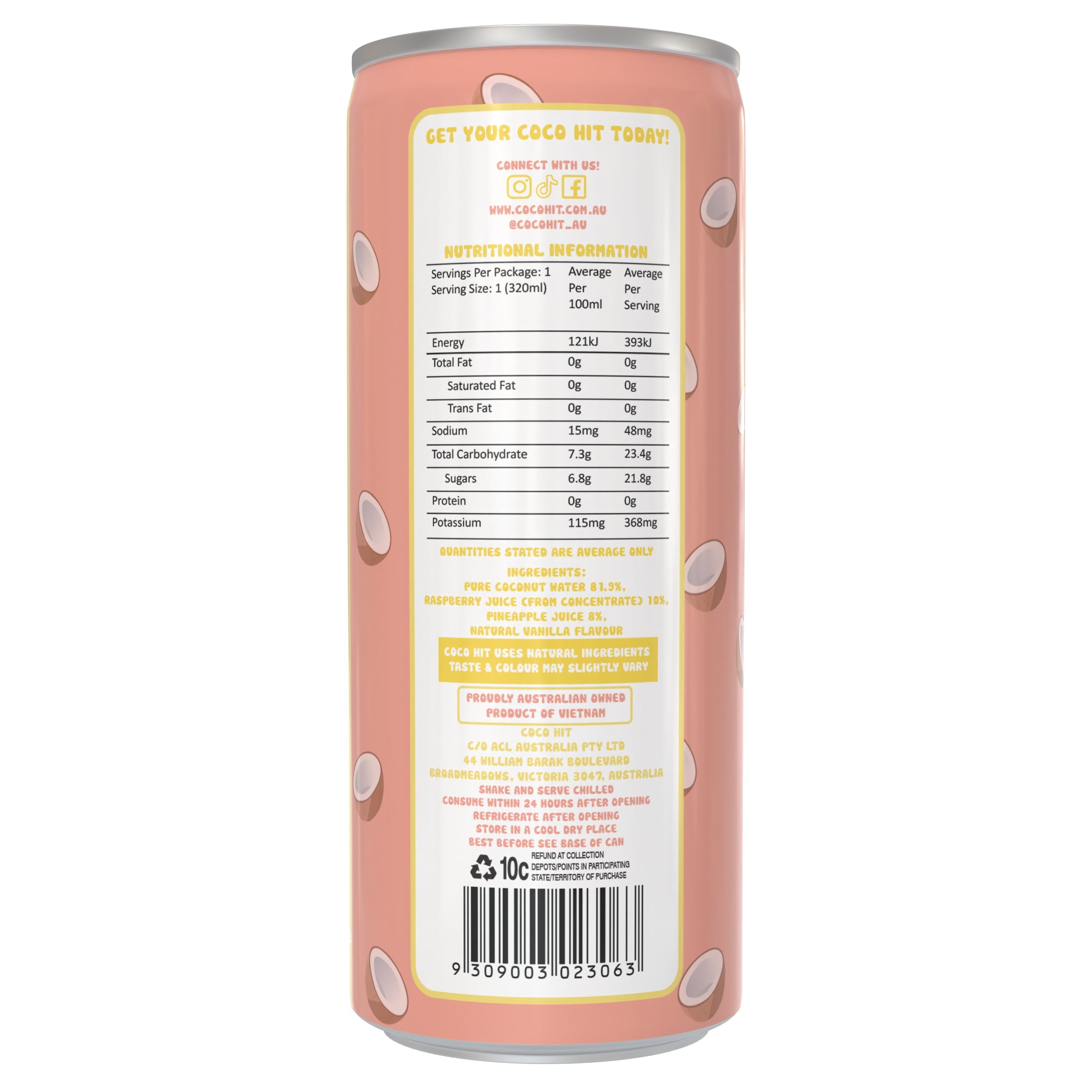 Ingredients: Pure Coconut Water 81.9%, Raspberry Juice from Concentrate 10%, Pineapple Juice 8%, Natural Vanilla Flavour