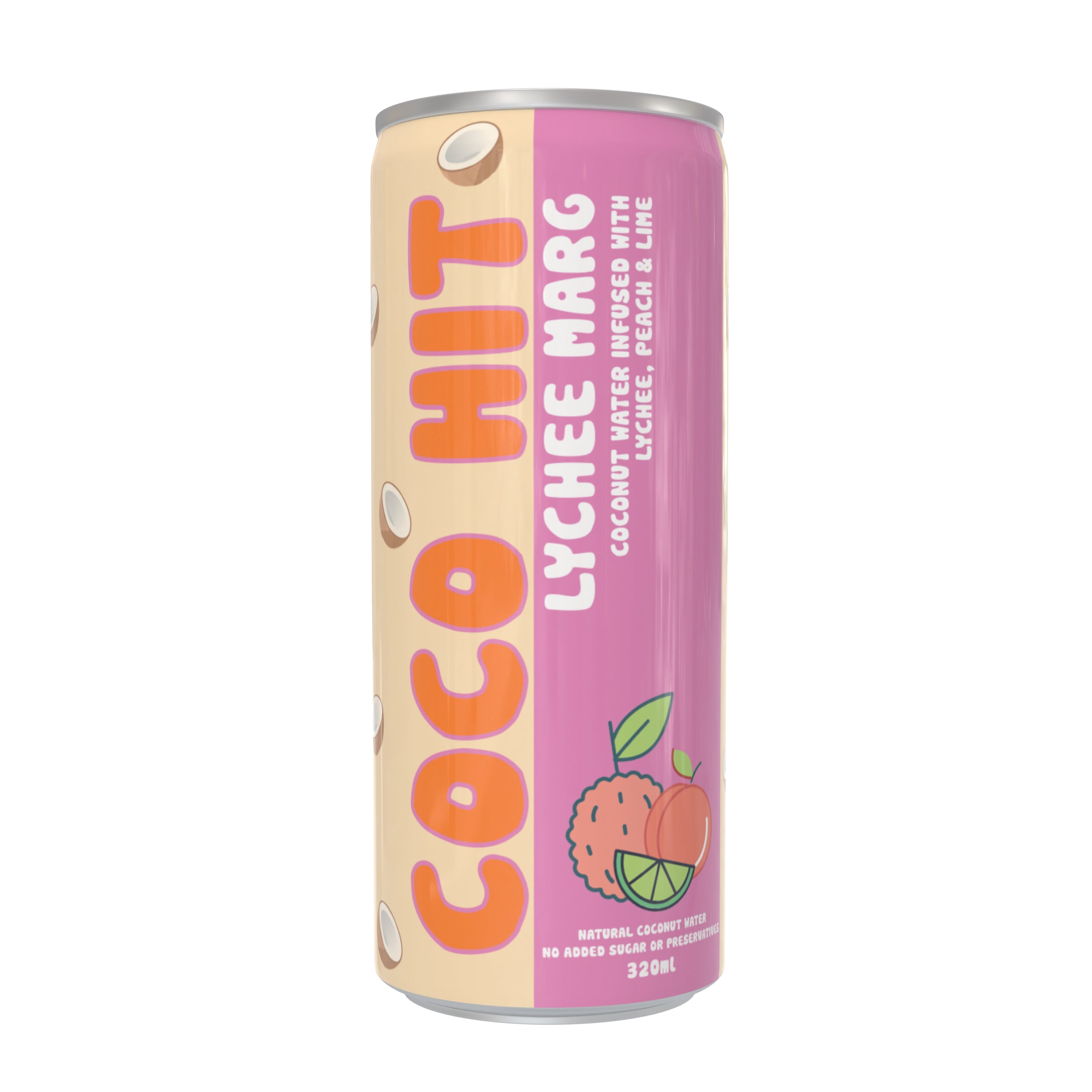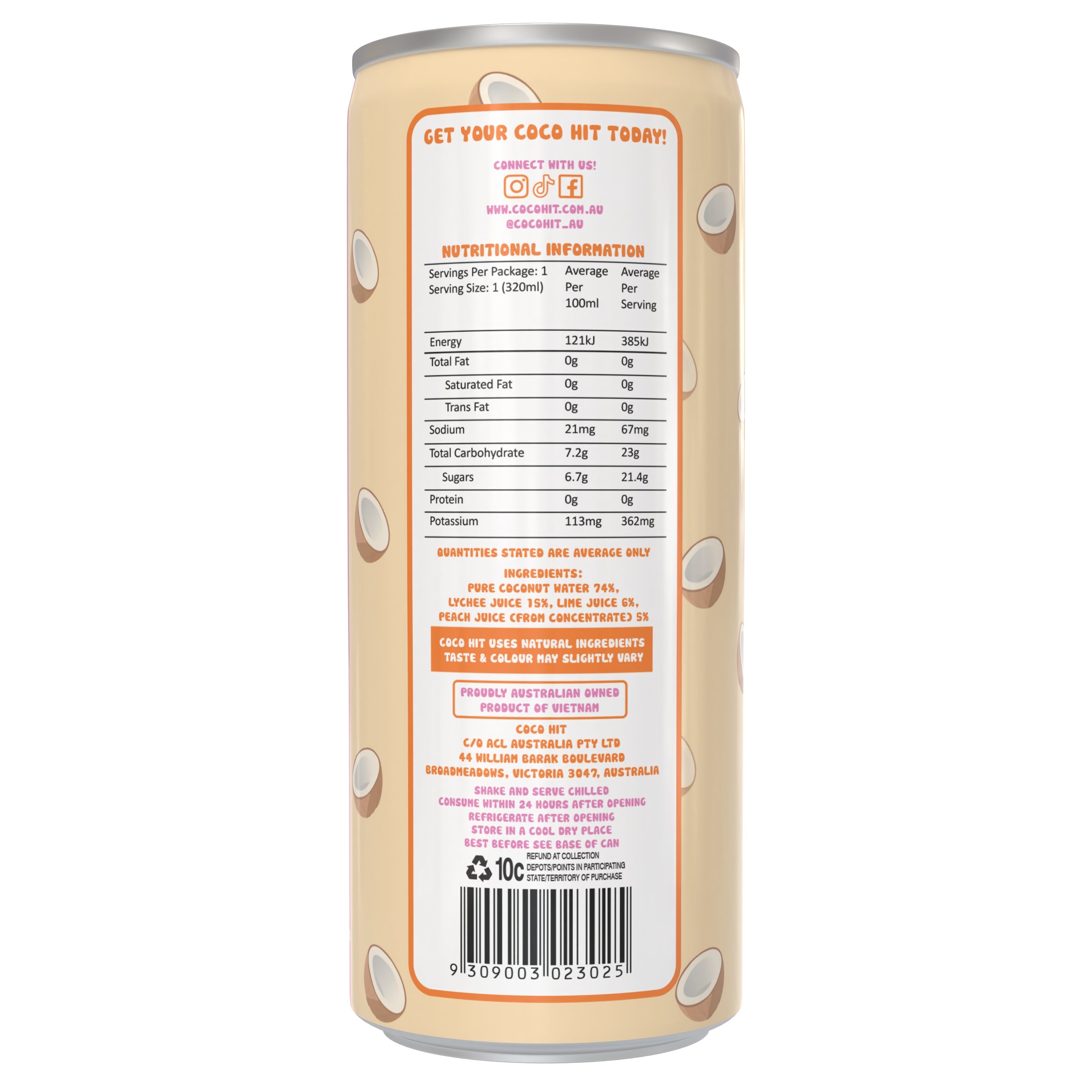 Ingredients: Pure Coconut Water 74%, Lychee Juice 15%, Lime Juice 6%, Peach Juice from Concentrate 5%