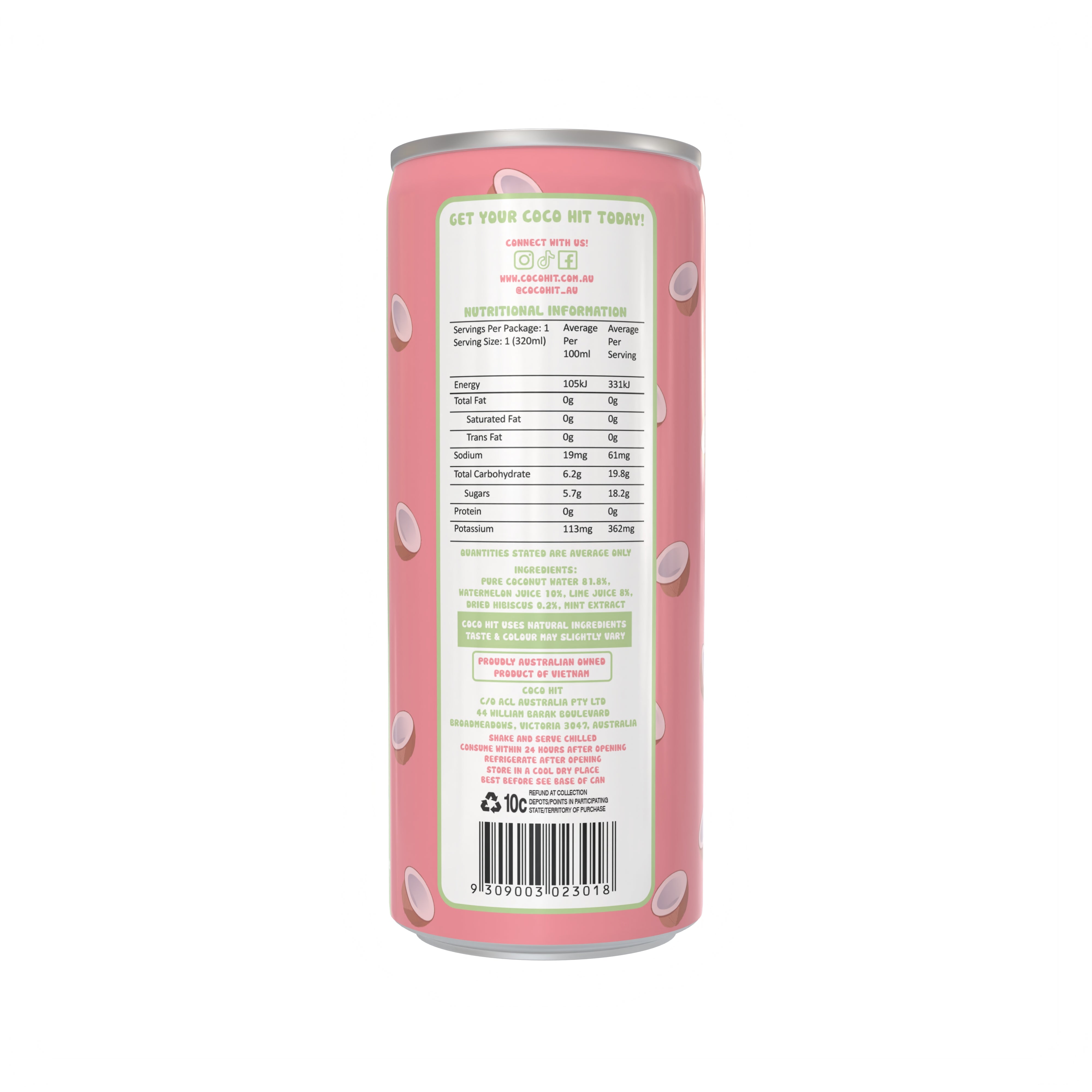 Ingredients: Pure Coconut Water 81.8%, Watermelon Juice 10%, Lime Juice 8%, Dried Hibiscus 0.2%, Mint Extract